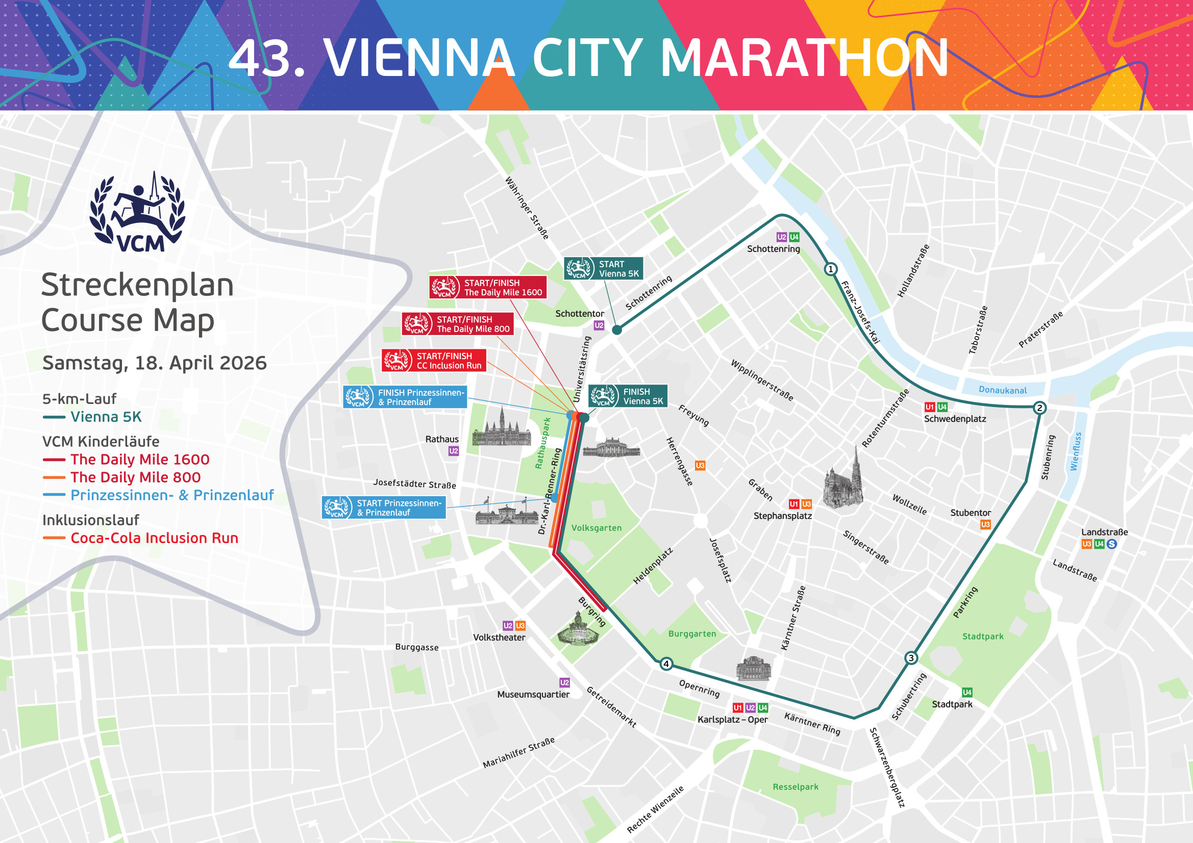 The Vienna City Marathon course is a great journey through the highlights of Vienna. From the start at Reichsbrücke, surrounded by the high-rises near UNO City, past iconic landmarks such as the Vienna State Opera, Schönbrunn Palace, and the museums, all the way to the finish on Ringstraße between Burgtheater and City Hall.