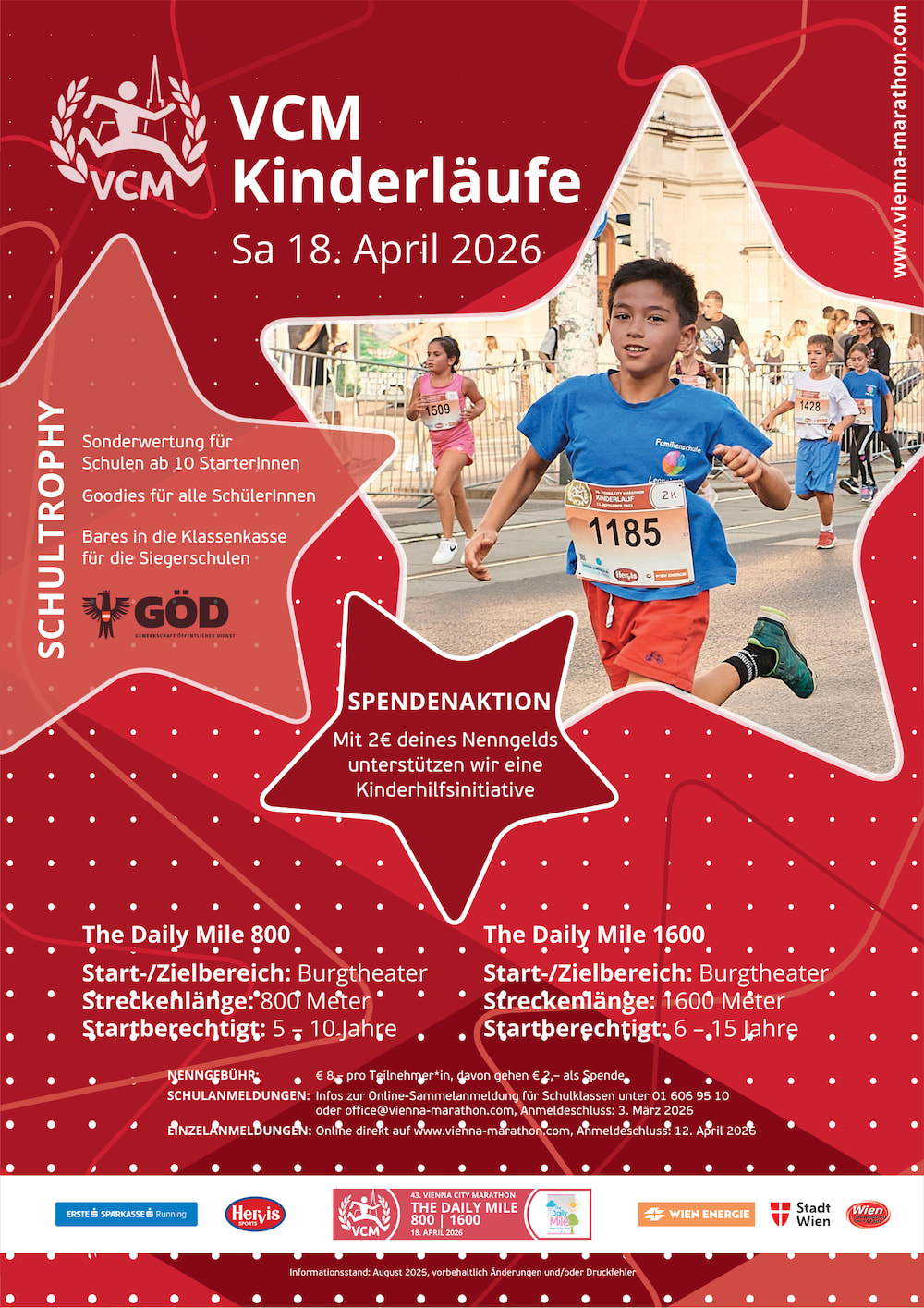 Die Gewerkschaft Öffentlicher Dienst ist langjähriger Kooperationspartner des VCM. Mit der GÖD Schultrophy gibt es in den Bewerben The Daily Mile 800, The Daily Mile 1600 und Vienna 5K eine Sonderwertung für Schulen ab 10 Starter*innen, bei der die 3 schnellsten Schulen pro Schulstufe ausgezeichnet werden. Die Siegesschule (VS, US und OS) erhaltet Bares für die Klassenkasse. Gewertet wird die Durchschnittszeit. Die Anmeldung zur GÖD Schultrophy erfolgt per Mail an office@vienna-marathon.com