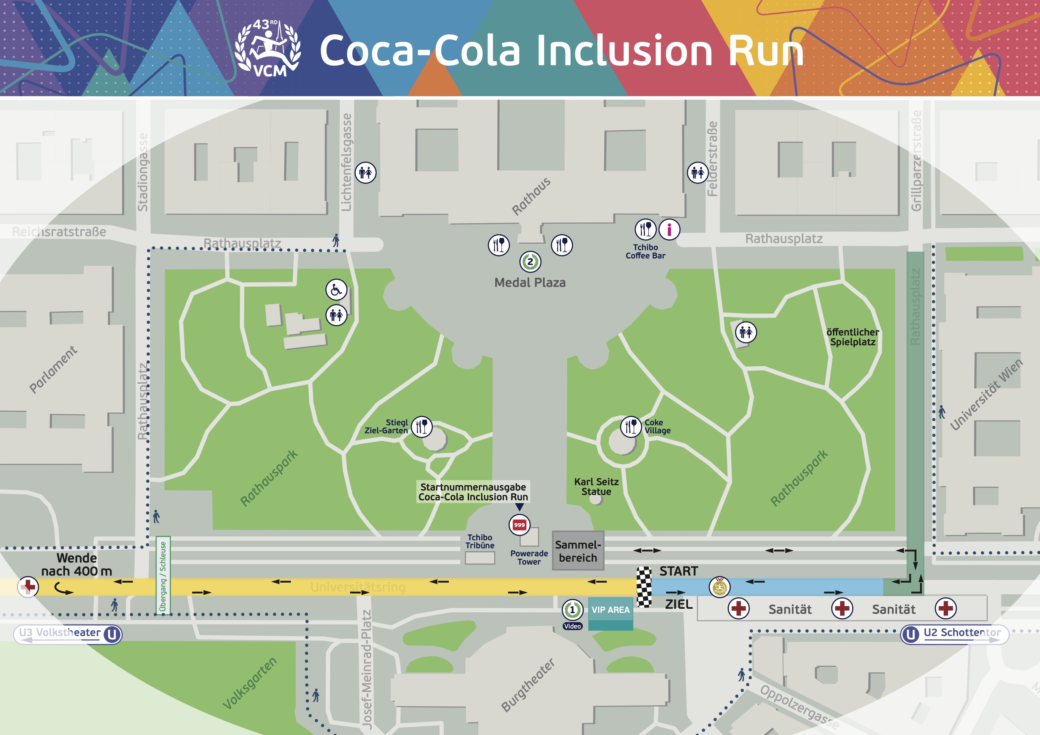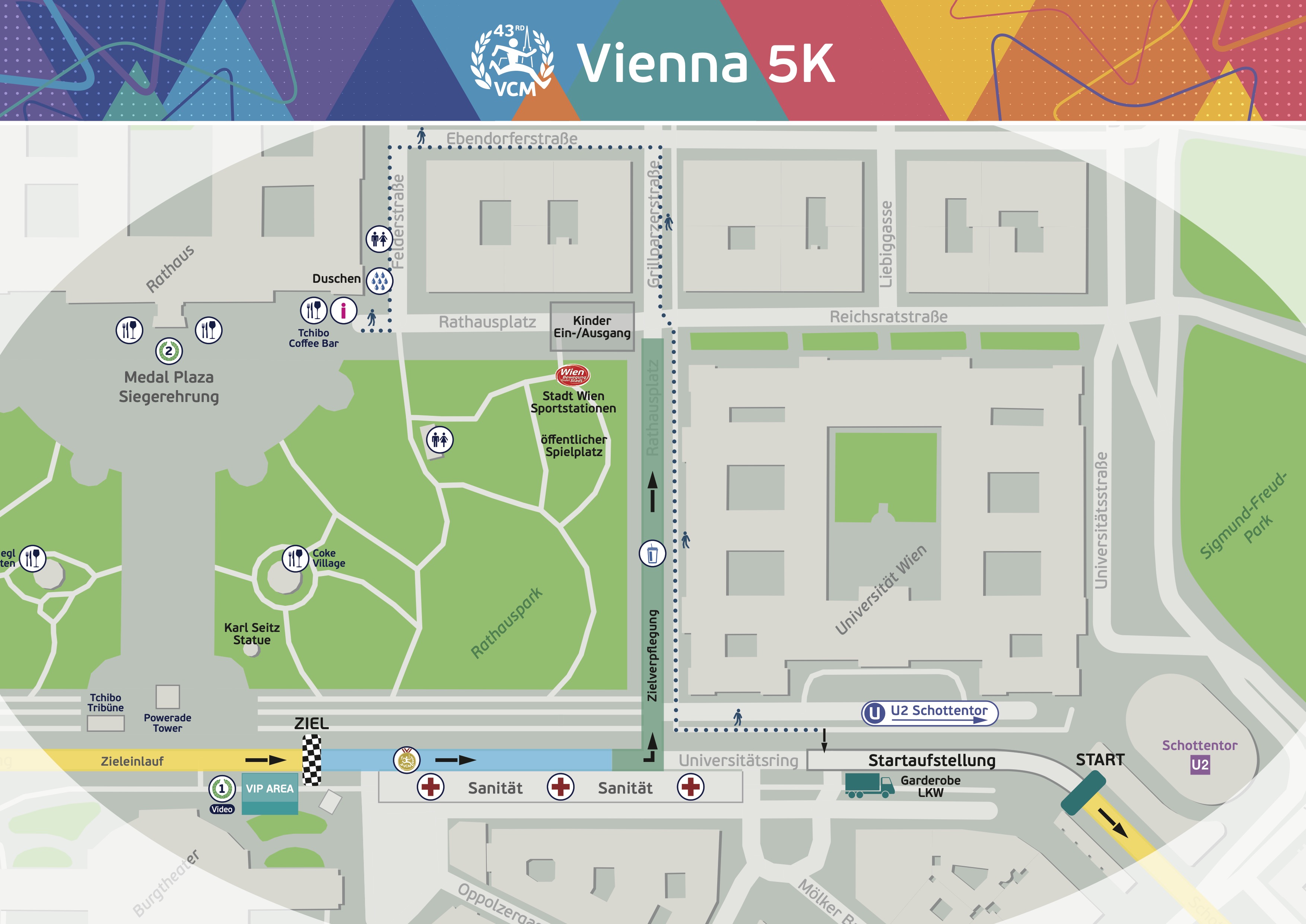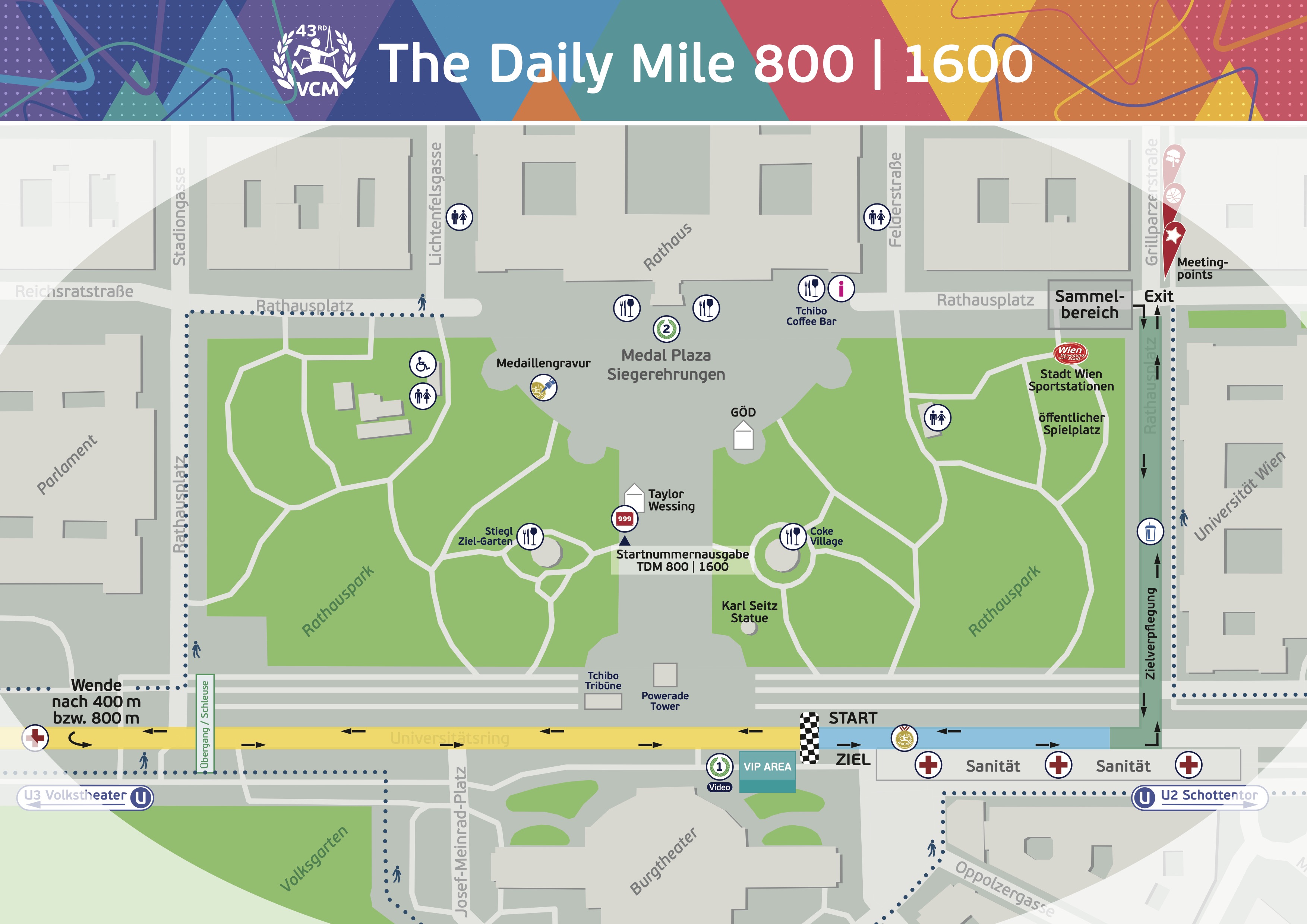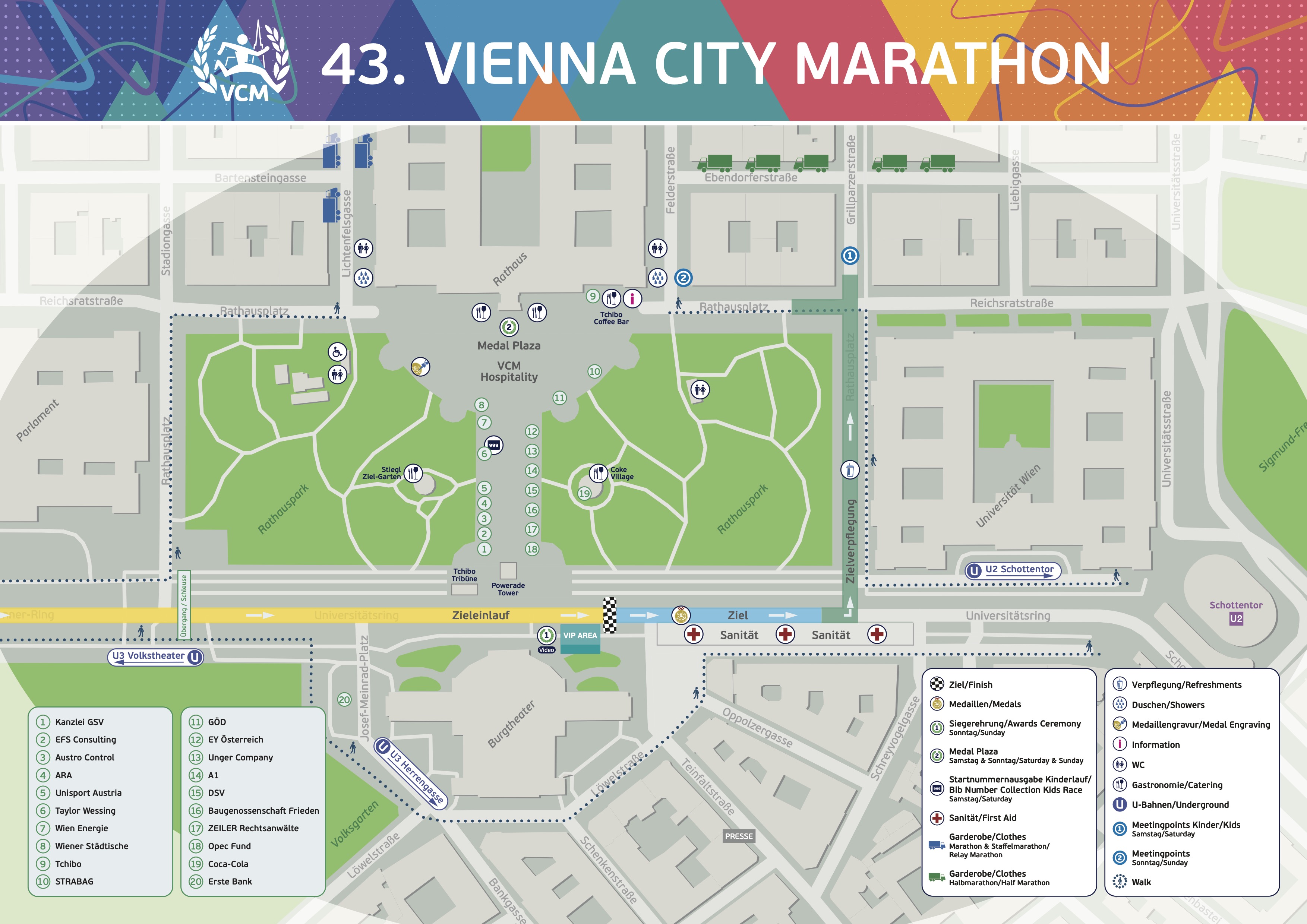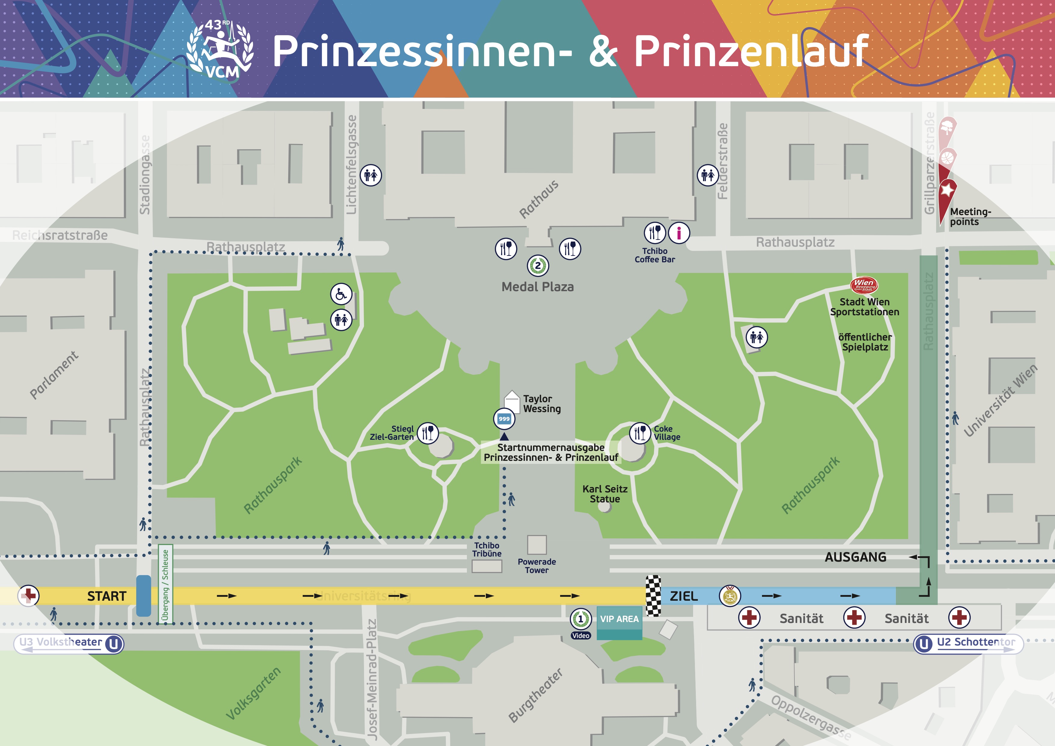 Hier findest du die Zielpläne für den Sonntag und für die einzelnen Bewerbe am Samstag: Gesamtübersicht, Wege, Garderoberückgabe, Duschen, Treffpunkte, Medaillengravur, Gastronomie, Bühnen, Hospitality und vieles mehr.Sonntag, 19. April 2026